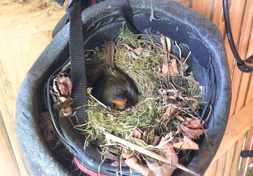 Fot. 10. Gniazdo rudzika (Erithacus rubecula) założone w kasku rowerowym. Źródło: https://www.camdennewjournal.co.uk/article/family-of-robins-make-nest-in-bike-helmet